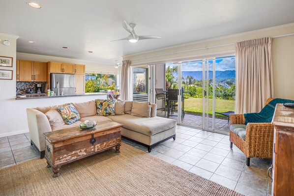This view can simply not be beat. Sunsets from the patio are to die for and make carry-out dinners a must because few restaurant views can compete. Location is perfect, 10-15 mins from downtown Hanalei and many popular beaches. Condo is exactly as pictured, very clean with AC in bedroom and newer washer/dryer. Kitchen also comes well stocked with dishes and cookware, would just recommend getting spices. My only issue I had with this condo is the code I received for the front door on check-in. Code would not work and had to be reset 4 times by Vacasa support (not host) before they got one that finally worked. Overall, would definitely recommend.