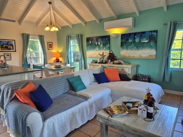 Ein farbenfroher karibischer Rückzugsort, nur einen kurzen Spaziergang vom atemberaubenden Pelican Beach, Leeward Cocodemer ist ein charmantes Haus im karibischen Stil in privaten, angelegten Gärten in der Wohnanlage Leeward, Providenciales. Dieser farbenfrohe, karibische Rückzugsort liegt nur einen kurzen Spaziergang vom abgelegenen Pelican Beach entfernt. An diesem ruhigen Ende der berühmten Grace Bay werden Besucher von unvergesslichem türkisfarbenem Wasser, unberührten weißen Sandstränden und spektakulären Sonnenuntergängen in Versuchung geführt. Gehen Sie auf der Suche nach Muschelschalen am Ufer entlang, beobachten Sie, wie Pelikane nach Fischen tauchen, im kristallklaren Wasser schnorcheln oder entspannen Sie einfach bei einem kalten Getränk und dem sanften Geräusch der Wellen, die am Ufer liegen.