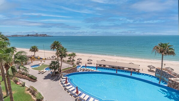 Diese schöne Wohnung befindet sich im 4. Stock des Resorts. Diese Wohnung bietet Platz für bis zu 4 Personen; zwei im Schlafzimmer und zwei auf dem Ausziehsofa im Wohnzimmer. Das Wohnzimmer dieser Einheit hat Wände, die in weichem gelbem venezianischem Gips beendet werden. Das Sofa ist aus hellbraunem Leder und die Kissen sind in Beige-, Khaki- und Brauntönen gehalten. An der Seite steht ein grüner Sessel aus Meerschaum und in der Mitte ein Couchtisch aus Glas. Unter dem Kaffeetisch befindet sich ein handgewebter Orientteppich mit Blumenmuster. Über dem Sofa befindet sich ein großer Spiegel, durch den sich der Raum sehr offen und geräumig anfühlt. Eine Schiebetür aus Arkadienglas führt Sie auf Ihre private Terrasse, auf der Sie den Sonnenaufgang oder Sonnenuntergang über dem Meer von Cortez genießen können. Das Wohnzimmer verfügt über einen Flachbild-Plasma-TV, einen DVD-Player, einen Videorecorder und eine Stereoanlage. Die Wohnung hat kein formelles Esszimmer, aber es gibt Sitzgelegenheiten auf den Barhockern, die an die Bartresen vor der Küche angrenzen. Die Küche verfügt über dunkle Holzschränke, Küchengeräte aus Edelstahl und Arbeitsplatten aus Granit. In dieser Küche finden Sie alles, was Sie für die Zubereitung eines Fünf-Sterne-Essens benötigen. Das Hauptschlafzimmer verfügt über eine Möbelsuite aus dunklem Holz, die ein Kingsize-Bett, Nachttische, eine Kommode und einen daran befestigten Spiegel umfasst. In der Ecke des Zimmers befindet sich ein Wandfernseher mit DVD-Player. Das Zimmer hat ein Fenster mit Blick auf den Ozean. Das Master-Badezimmer verfügt über ein Waschbecken und eine begehbare Dusche aus Marmor. Eine Wand des Badezimmers ist in leuchtendem Orange gestrichen und die anderen sind in Schweizer Kaffeeweiß gehalten.