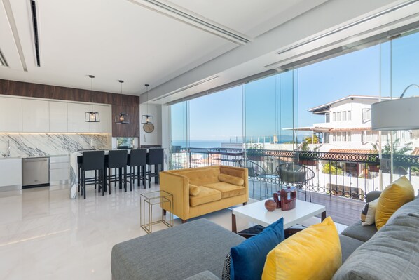 Sie werden Ihren Platz auf der 5. Etage mit einer weitläufigen privaten Terrasse und deckenhohen Fenstern lieben, die Ihnen die schöne Aussicht direkt von Ihrem Wohnbereich aus bieten. Ihr Wohnraum wurde professionell gestaltet und mit hochwertigen Möbeln ausgestattet und verfügt über Marmorböden. Das Wohnzimmer verfügt auch über ein bequemes Sofagarnitur und einen Couchtisch. Diffuse LED-Beleuchtung unterstreicht eine raffinierte, weiche und elegante Umgebung. Zur intelligenten Elektronik gehören Nest-Thermostat, August-Smart-Lock und zwei Smart-Flachbildfernseher.