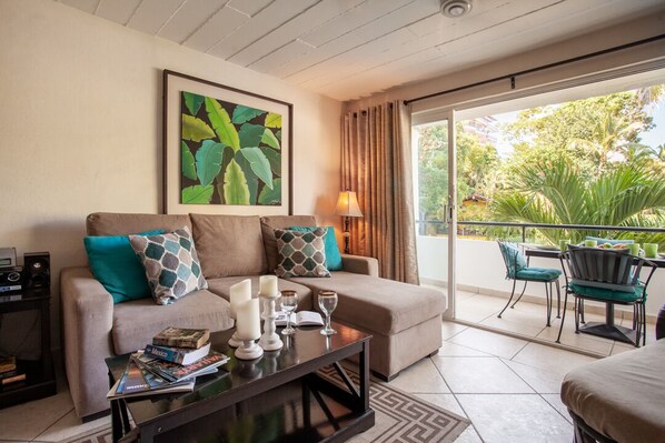 The Main Bedroom features a king size bed, air conditioning, en-suite bathroom and closet. Sliding glass doors open to the balcony with a view to the west, through the trees and toward the ocean with a small ocean view.