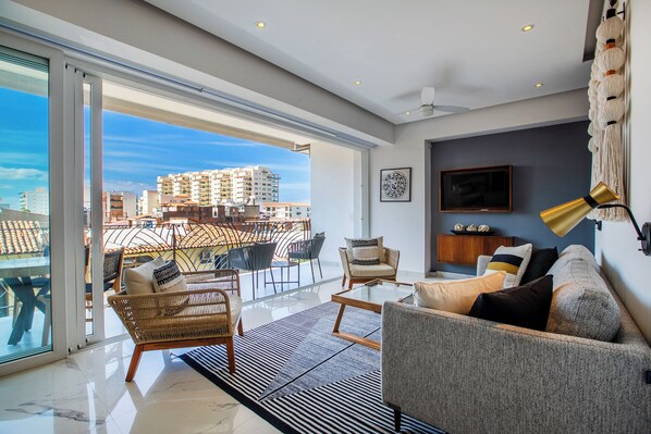Consists of a sofa and comfy chairs to enjoy the view through the floor-to-ceiling windows or entertainment on the flat-screen smart TV. Slide open the large windowed doors to access the private patio.