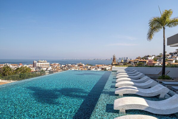 - Rooftop infinity pool with panoramic city and ocean views