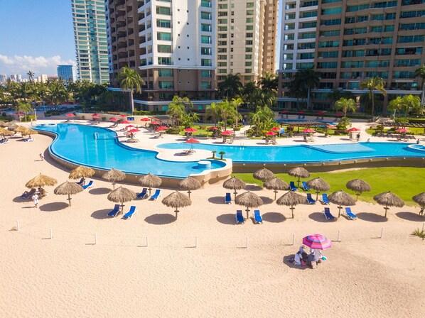 High-End-Eigentumswohnungen in Privatbesitz mit Gated Sicherheit vor Ort 24-7. Brandneue 1.831 Quadratmeter im 21. Stock mit herrlichem Blick auf das Meer und die Berge und einen Balkon, der sich um Sie herum zu genießen. Dies ist eine voll ausgestattete Wohnanlage mit Waschmaschine und Trockner. Im Grand Venetian haben Sie 4 Pools zur Auswahl und 2 davon mit Infinity-Pools am Strand. 5 übergroße Whirlpools. Strandstühle mit Palapas. Eine Restaurantbar, Tiefgaragenplätze, ein voll ausgestattetes Fitnesscenter, ein Spielzimmer, 2 Tennisplätze und ein Concierge-Service vor Ort. Das Hotel liegt in der Hotelzone 10 min. vom Flughafen und 10 min. in die Innenstadt von Puerto Vallarta. Restaurants, Lebensmittelgeschäfte und ein Einkaufszentrum sind zu Fuß erreichbar.