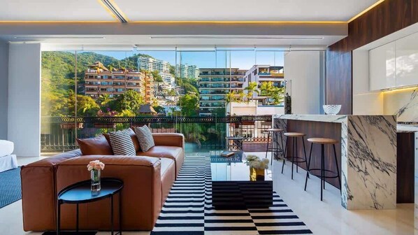 This unit has a sleek, contemporary design, complete with reveal/ floating baseboards for example, which you don't see in many rental properties. The building has one of the best rooftop pools in PV, complete with a tended cash bar from 10 am to 10 pm. The location is just a few blocks from almost anywhere you'd want to go in this part of town, and compared to several other buildings in the general area, this one is quieter.