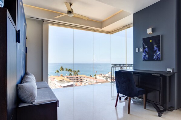 MASTER BEDROOM - Bietet einen atemberaubenden Blick auf die wunderschöne Banderas Bay, den Los Muertos Beach Pier und einen der nationalen Meeresparks Mexikos - Los Arcos. Genießen Sie eine gemütliche Siesta oder eine Nachtruhe auf Ihrem Pillow-Top-Kingsize-Bett, das mit Bettwäsche aus ägyptischer Baumwolle bezogen ist. Es gibt viel Stauraum, ein Bluetooth-Lautsprechersystem von Bose, tragbare USB-Ladegeräte, einen Safe zur Aufbewahrung wichtiger Dokumente und verschiedene andere Annehmlichkeiten für Ihren Aufenthalt.