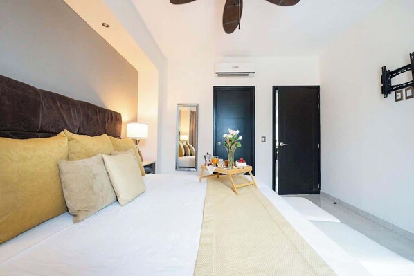 When it’s time to rest and recharge for the night, find a plush king bed in the bedroom, ready to offer you a good night’s sleep with blackout curtains for sleeping in late if you’d like. There are nightstands and reading lamps on both sides, a full-length mirror ample closet space for your things with a safe box for your valuables. The bedroom has direct access via wall-to-wall sliding glass doors to a large terrace with some chairs overlooking the street.