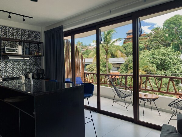 The space itself was carefully designed to provide all the comfort needed for a memorable stay. The rooms are decorated with local tiles and art, comfortable furniture, hammocks, air conditioner, high ceilings, a fully stocked kitchen with modern appliances, and an elevator. Our rooftop terrace is one of a kind, with lounge chairs surrounding an infinity pool that overlooks town, with the lush tropical forest in the background. The setting is completed by a bar, grill, and seating space that set the atmosphere for unforgettable memories.