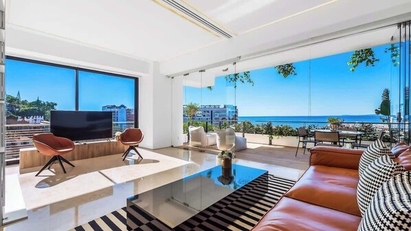 Enjoy the breathtaking panoramic view from our beautiful terrace, a peaceful haven adorned with lush plants.