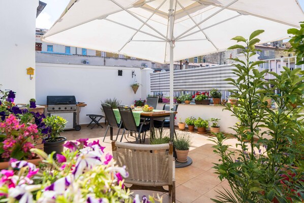 Nur 15 Autominuten vom Flughafen entfernt, benötigten wir zunächst kein Auto. Der schöne Markt in 5 Gehminuten vom Appartement findet täglich statt. Hier gibt es eine Fischhalle und eine zweite Halle mit Fleisch und Käse, sowie viele Marktstände mit Obst und Gemüse - alles frisch und regional. So haben wir den großen Grill auf der Dachterrasse gern regelmäßig genutzt. Zahlreiche Restaurants und Cafés findet man direkt vor der Tür. Das Appartement ist mit allem ausgestattet, was man benötigt, wenn man sich selbst verpflegen möchte. Wir wurden eingeladen, uns am gut gefüllten Weinregal zu bedienen, im Kühlschrank befanden sich Erfrischungsgetränke für uns. Die sehr nette Vermieterin gab uns gute Tipps für Einkauf und Besichtigungen. Bettwäsche und Handtücher waren für unsere 14 Urlaubstage sehr reichlich vorhanden. Das Bett mit bequemer Matratze ist sogar mit einem Topper sehr rückenfreundlich ausgestattet. Sehr angenehm empfanden wir die separate Toilette mit Fenster. Das moderne Bad mit großer Dusche ist auch komfortabel. Das Wohnzimmer mit moderner Musikanlage und Fernsehen war an einem Gewitterabend unser Rückzugsort, sonst haben wir die Abende bei schönem Wetter auf der Dachterrasse verbracht. Die ist mit zahlreichen Kübelpflanzen liebevoll gestaltet. Die Vermieterin hat sich gefreut, dass ich morgens regelmäßig eine Runde mit der Gießkanne gemacht hab. Bei 30° Junitemperaturen war das trotz großem Sonnenschirm und Sonnensegel auch nötig.… Nachteile? Uns hat nur etwas gestört, das die Flutlichtanlage eines Sportplatzes neben der Dachterrasse an zwei Abenden bis 23-24 Uhr angeschaltet war. Die Lärmbelästigung war eher gering, nur die Beleuchtung war unromantisch 😉 insgesamt haben wir hier tolle 14 Tage verbracht und kommen gern wieder, wir haben noch nicht alles gesehen!