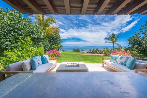One of the standout features of Casa Marlago is its stunning views. Situated on a corner lot, the villa boasts ocean views. The outdoor terrace, overlooking one of the two Jack Nicklaus Signature Golf Courses in Punta Mita, offers a breathtaking panorama of the Bahia de Banderas and the Pacific Ocean. Comfortable loungers are placed by the swimming pool, allowing you to relax and soak in the scenery. The outside dining area and adjacent lounge provide the perfect setting for evening meals and cocktails, while the outdoor fire pit creates a cozy ambiance on cooler nights.