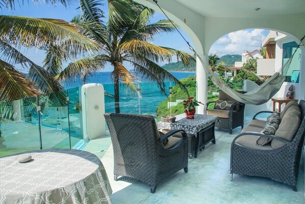 Casa Lamanai is a two bedroom upstairs house which overlooks the Pacific Ocean (The downstairs is a separate house that is rented long term by a single lady who lives here with her pets ) It is located on a cliff above one of the most beautiful beaches in the area. It is right around the point from the Punta Mita Four Seasons Resort. As you cook, eat lunch, lounge in the hammock or browse the internet you are able to gaze out at the ocean and enjoy its many changing aspects. Two palm trees move gently in the breeze and beyond and you then you can often watch whales and dolphins as they play in the sea.