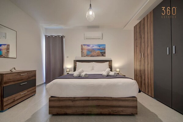 Main Bedroom: Double bed, private balcony, and en-suite with shower.
