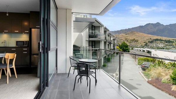 The apartment has a nice view to the Remarkables Mountain Range and down the lake towards Frankton. Pano No. 5 has great heating options with gas fireplace plus heaters in both bedrooms and bathrooms.