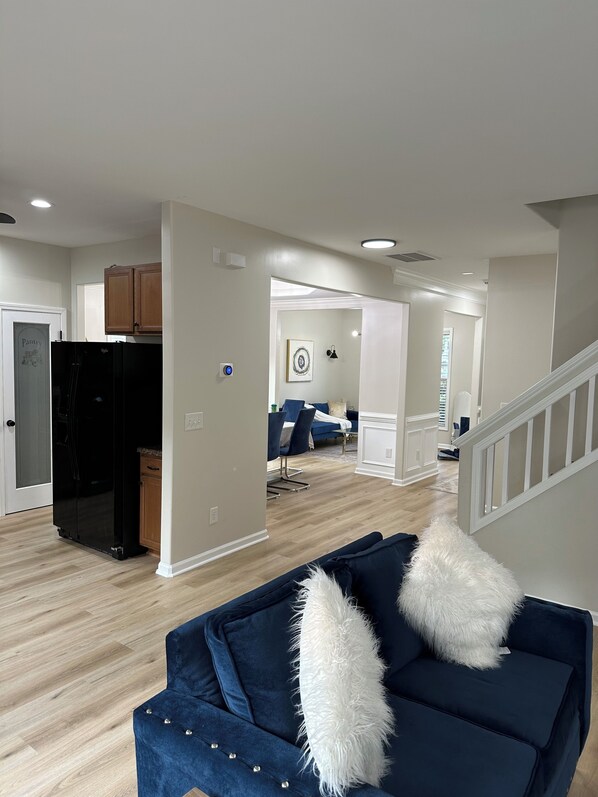 The beautiful living room can accommodate all the guess comfortably and is equipped with 65- inch Roku TV (Netflix and Peacock). It openly connects to the fully stocked kitchen for all your cooking needs. There is also an additional small seating area on the right upon entering the house that connects to the dining room. A nice refinished half bath down the hall beside the garage door. The garage can be used for storing your belonging or other needs.