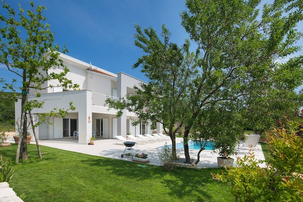 Villa Chiara ist eine geräumige Villa mit vier Schlafzimmern und privatem Pool in der Region Labin/Rabac im Osten Istriens, nur 4 km vom Meer entfernt. Die Villa bietet eine wunderschöne Aussicht auf das Meer und die Insel Cres und bietet Platz für bis zu 9 Personen. Im Erdgeschoss befinden sich ein Wohnzimmer und eine voll ausgestattete Küche mit Essbereich. Durch die Terrassentüren gelangen Sie auf die attraktive Terrasse und den Pool. Auf dieser Etage befindet sich auch ein Schlafzimmer mit zwei Einzelbetten und einer Dusche. Auf der ersten Etage befinden sich 3 Doppelzimmer mit Balkonen mit Blick auf den Pool und einem wunderschönen Panoramablick auf das Meer. Zwei der Schlafzimmer verfügen über ein eigenes Badezimmer mit Dusche. Auf dieser Etage befindet sich auch ein zusätzliches Gemeinschaftsbad mit Badewanne. Gäste, die hier übernachten, werden die wunderschöne ländliche Umgebung und die ruhige Umgebung mit einem privaten Pool und einem eleganten Garten zu schätzen wissen. Der Außenbereich verfügt über eine Terrasse mit einem 30 m2 großen privaten Pool, bequemen Sonnenliegen und einer offenen Terrasse mit Grill, auf der Sie Ihre Lieblingsgerichte zubereiten und teilen können. Auf der Terrasse am Pool gibt es einen Tischfußball für Unterhaltung während Ihres Aufenthalts. Zu den weiteren Spiel- und Unterhaltungsmöglichkeiten (gemeinsam mit zwei weiteren Nachbarvillen) gehören: ein kleiner Fußballplatz, ein Kinderspielplatz, Tischtennis und Billard.