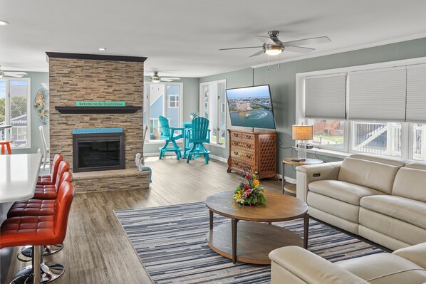 Open living/kitchen with sectional, TV & electric fireplace; dining for 6 + island for 4