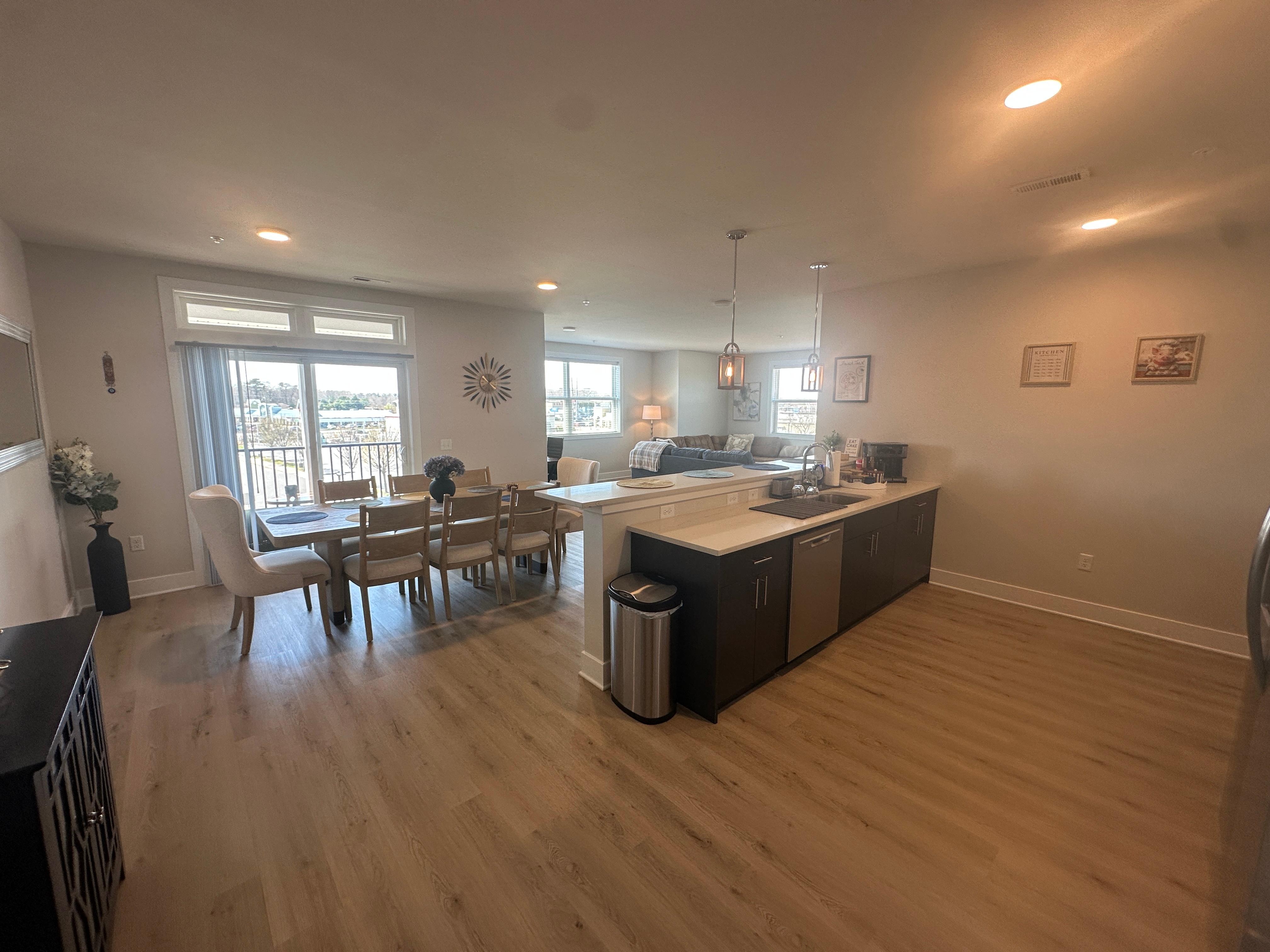 We kicked off our spring break at this condo March 28-30. Proximity to high end outlets and excellent restaurants and bars was a huge plus. The unit is spacious and luxurious, with top quality furnishings and decor. Small touches like a well-stocked coffee/tea station, full sized washer/dryer, and shampoo/conditioner/body wash dispensers in the showers were appreciated. The kitchen has high-end appliances and the living room and bedroom furniture is comfortable and classy. The covered third floor patio catches the afternoon sun and has a great breeze. We walked to 302 Social for an excellent lunch of pot roast sandwiches and blackened tuna. We worked off that meal in the spacious gym with state of the art machines and then walked our dog in the dog run. Parking is free and convenient. The condo was very large, with three separate bedrooms (one with bunks) and a massive great room for entertaining. This is located away from the densely packed tourist areas but just a very short drive to the beaches.