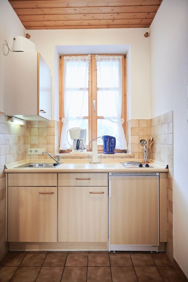 Gut ausgestattete, kleine Küchenzeile im Flur mit 2-Plattenherd und Mikrowelle