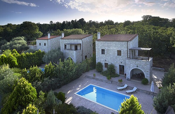 Stone villa with pool in the middle of green hills