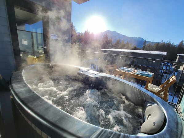 Step out onto the private balcony to enjoy your hot-tub, take in the mountain views, and enjoy gorgeous unimpeded views of the sunsets over the mountains.