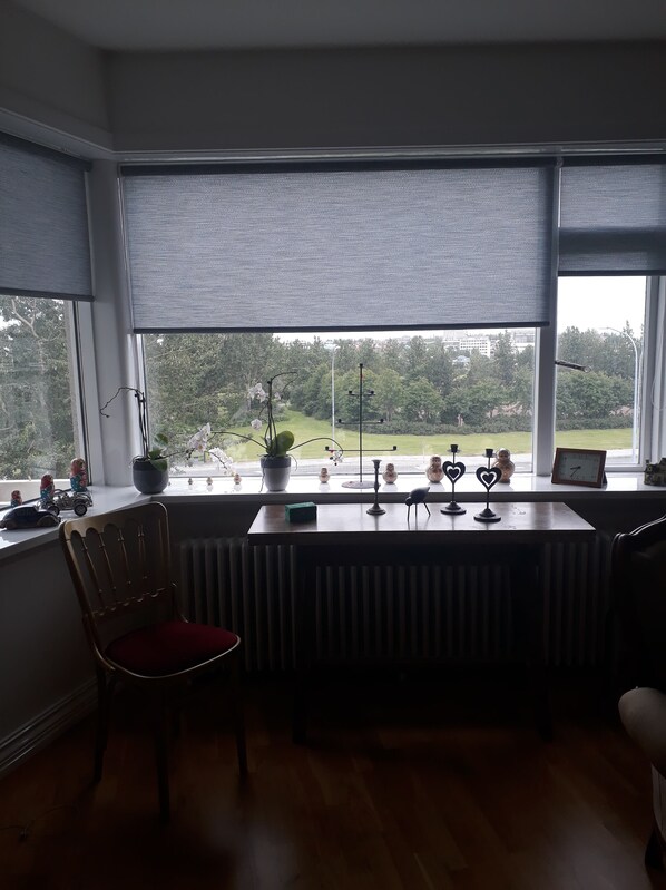 Schöne Wohnung, im dritten Stock, vor einem lokalen Garten und Kjarvalstaðir Kunstmuseum.