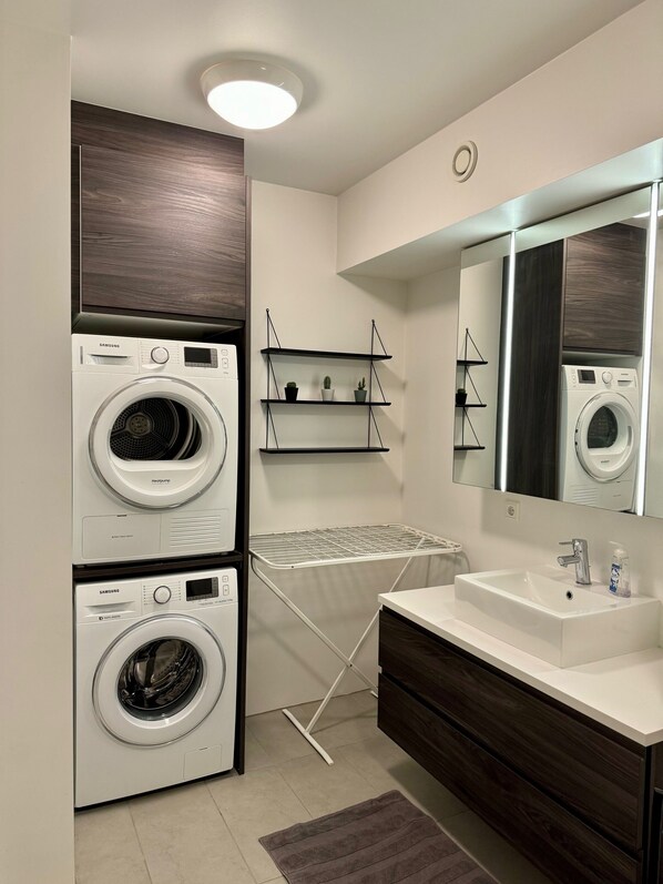 The apartment is fully furnished and kitchen is well equipped with dishwasher, microwave, toaster and more. Large bathroom with heated floor, washer and dryer. The bed is freshly made for each stay and towels arranged.
