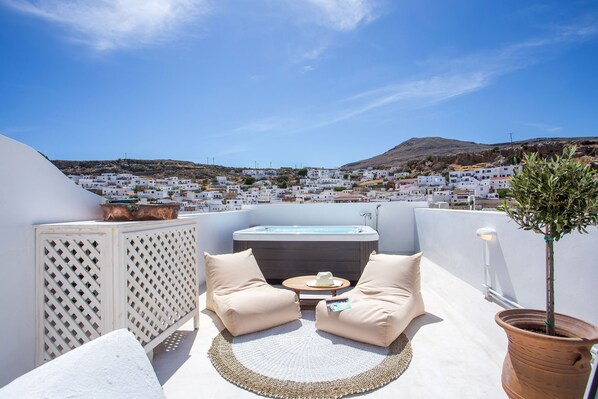 Cielo Suite is on the ground floor and hosts up to 4 guests. There’s an incredible bedroom with a double bed and a double sofa bed in the living room. Also, there is a modern bathroom with a shower. There’s free WIFI access throughout the property as well as a smart TV. Guests will find a beautiful kitchen with a kitchen stove and all the necessities for a meal preparation. Outdoors, there’s a terrace with a heated jacuzzi and a private patio to enjoy your time with your friends or family.