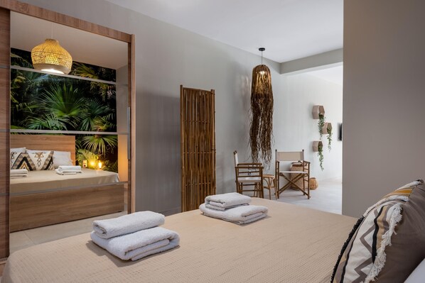 The incredible Port Living Apartment is found on the first floor and accommodates up to 4 guests. It has a stylish bedroom decorated in an exotic design. The bedroom is open plan with the living room and the kitchen. In the same area, there’s a comfy double sofa bed in the living room and a modern bathroom with a shower. All areas are fully airconditioned and offer free WIFI access. The apartment has a fully equipped kitchen that is suitable for any meal preparation accompanied by a seating area. There’s a comfy living room with a smart TV where you can relax while you’re preparing for your next outdoor activities. Outdoors, there’s a furnished balcony where you can relax and enjoy the summer atmosphere.