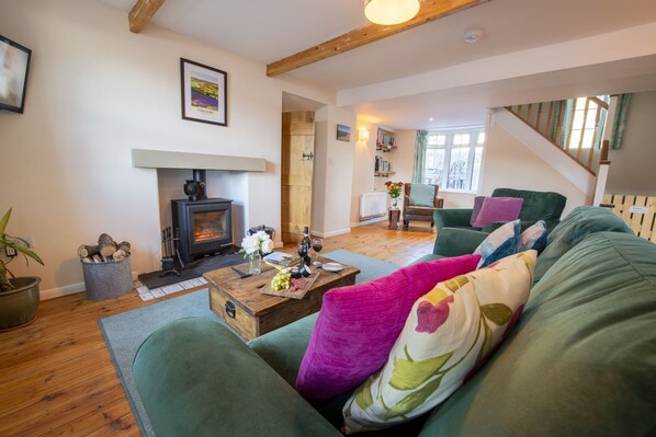 With a wood burning stove, comfortable seating and Smart television.