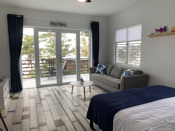 Das Ocean Loft ist ein Studio mit offenem Grundriss im zweiten Stock des The Beach Pad. Dieses Loft macht seinem Namen alle Ehre und bietet vom privaten Balkon einen herrlichen Meerblick. Wählen Sie je nach Wunsch zwischen einem Kingsize-Bett oder zwei XL-Einzelbetten. Der Wohnraum umfasst eine ausziehbare Couch mit einer Queen-Size-Premium-Gel-Memory-Foam-Matratze. Das Ocean Loft verfügt über eine komplett ausgestattete Küchenzeile, Essbereiche im Innenbereich, 10-Zoll-Decken, frische Bettwäsche, einen geräumigen Kleiderschrank und ein Bad mit ebenerdiger Dusche. Ein Parkplatz ist im Dachgeschoss enthalten, und alle Gäste haben Zugang zur Dachterrasse, zum Grillplatz und zur Lounge. Schlendern Sie durch die Eingangstür und erkunden Sie Sandy Beach, Pool's Beach, Restaurants, Bars, Wassersport, Wellness und Einkaufsmöglichkeiten.