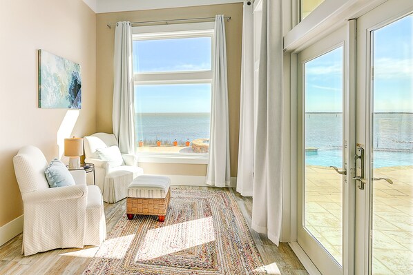 Vaulted ceilings soar in the Great Room, detailed with a gas fireplace and a smart TV. A wall of retractable doors opens to stunning water views and the pool patio, creating a seamless indoor/outdoor living environment. Upstairs, an additional living room has a sectional and a smart TV. The immaculate chef’s kitchen boasts two spacious islands, a full suite of stainless steel appliances, and plenty of cookware. Perch at the kitchen island, then gather for mealtime around the dining table.