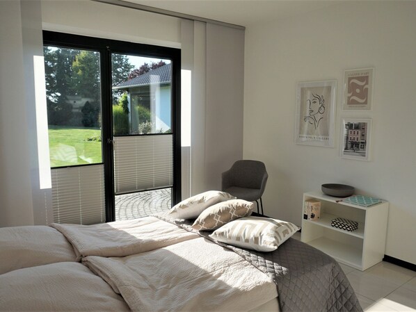 Vom zweiten Schlafzimmer aus hat man einen Blick in den weitläufigen Garten.