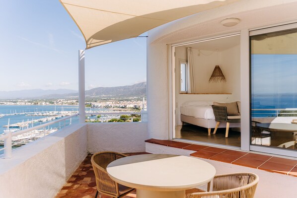 Exklusives Studio für zwei Personen, ideal für Paare oder Reisende, die ein einzigartiges und stilvolles Erlebnis in Roses suchen. Dieser Raum ist offen und modern gestaltet. Von der Terrasse aus genießen Sie einen unvergleichlichen Blick über die Bucht von Roses, wo die Sonnenuntergänge für einen wundervollen Abend sorgen.