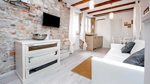 CA' 3 VIE LAVANDA – Ein-Zimmer-Apartment ist ein 3-Sterne-Apartment im Herzen von Rovinj, in der Fußgängerzone. Der nächste Strand ist nur 2 Gehminuten entfernt. Die Wohnfläche beträgt 46 m². Das Apartment erstreckt sich über zwei Ebenen und besteht aus einem Schlafzimmer mit eigenem Bad, einem Wohnzimmer mit Schlafcouch für 2 Personen und einem weiteren Badezimmer. Es befindet sich im zweiten und dritten Stock eines komplett renovierten Altbaus. Dieses Apartment mit voll ausgestatteter Küche, Sat-TV, Klimaanlage und kostenlosem WLAN ist ideal für Paare, die ihren Urlaub verbringen möchten. Die nahegelegene St.-Euphemia-Kirche, der Bauernmarkt, zahlreiche Restaurants und der Strand garantieren ein rundum gelungenes Rovinj-Erlebnis. Obwohl unsere Wohnung aufgrund ihrer Lage in der Fußgängerzone nicht mit dem Auto erreichbar ist, stehen Ihnen gegen eine geringe Gebühr Gepäckwagen zur Verfügung. Die Unterkunft verfügt über keinen eigenen Parkplatz, der nächste öffentliche Parkplatz (gegen Gebühr) befindet sich jedoch 250 m entfernt. Gerne organisieren wir auch einen Transfer vom Flughafen zur Wohnung. BETTENBESCHREIBUNG: 1 Doppelbett + 1 Schlafsofa MAXIMALE BELEGUNG: 4 Personen Optimale Gästeanzahl: 2 Personen KINDER: Ein Kind unter 3 Jahren übernachtet kostenlos in den vorhandenen Betten. HAUSTIERE: Haustiere sind gegen einen Aufpreis von 10 € / Tag erlaubt. ANREISE / ABREISE: Check-in: 15:00 - 22:00 Uhr, Check-out: 06:00 - 10:00 Uhr Entfernungen: Strand: 100 m, Stadtzentrum: 0 m, Lebensmittelgeschäft: 20 m, Restaurant: 10 m, Busbahnhof: 300 m, Flughafen: 40 m, Hafen: 50 m