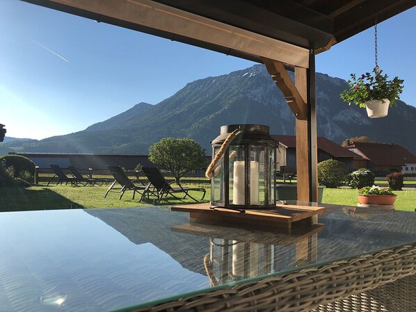 Komfortable **** Ferienwohnung (44qm) mit Abendsonne für 2 Personen im 1.OG, mit 2 Balkonen (Südwest Unternbergblick und Nordwest Hochfellnblick), Dusche/WC, Schlafzimmer mit Flat-TV, Zimmersafe, Wohnzimmer mit Flat-TV und Schreibtisch, Essecke, EBK/Spülmaschine/Backofen/Ceranfeld, Highspeed-Internet via Wlan, etc.