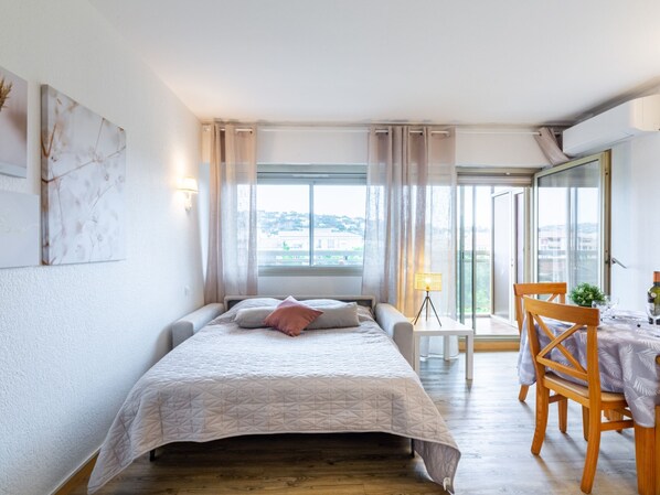 1-Zimmer-Wohnung 25 m2 im 4. Stock. Einfach und zweckmässig eingerichtet: Wohn-/Esszimmer mit 1 Doppeldiwanbett (140 cm, Länge 190 cm), TV. Ausgang zum Balkon. Eingang mit 1 x 2 Etagenbetten (80 cm, Länge 190 cm). Kochnische (2 Kochplatten, Geschirrspüler, Wasserkocher, Mikrowelle, elektrische Kaffeemaschine). Bad/WC. Heizung, Klimaanlage. Balkon 6 m2, Ostlage. Balkonmöbel. Sicht auf das Städtchen. Zur Verfügung: Safe. Internet (WLAN, extra). Parkplatz Nr. 168. Bitte beachten: Wohnung auf Strassenseite. Nichtraucher-Unterkunft, Parkplatz nur für kleine Wagen. Maximal 1 kleines Haustier/Hund erlaubt. Rauchmelder. Anstelle eines abgeschlossenen Schlafzimmers befinden sich manche Schlafplätze in einem offenen Bereich (Galerie, Nische etc.). 83115003000AK