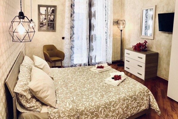 - SCHLAFZIMMER 1: Doppelbett, Split-Klimaanlage, Kleiderschrank, Fernseher, Kommode und Sessel.