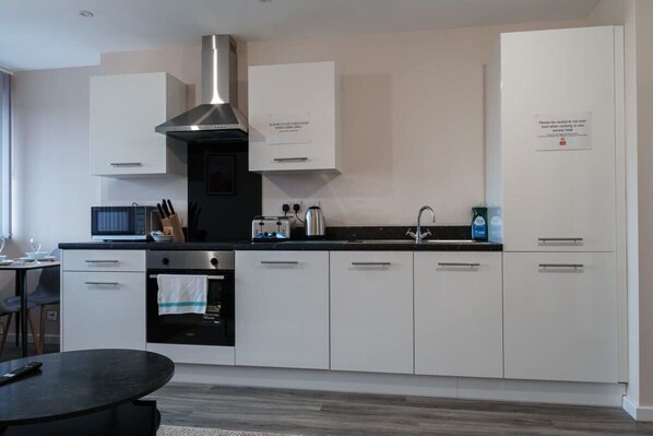 This beautiful apartment is set within a contemporary development, has been finished to a fantastic standard and features comfortable furnishings and modern appliances. The open plan living area comprises a modern fully equipped kitchen with everything you need to cook your own meals at home, a dining table, sofa and smart Tv. There is high speed broadband throughout the apartment. The cosy and bright bedroom features plenty of storage space for clothes and a comfortable bed made up with crisp hotel linen. The modern family bathroom has a shower and bath, toilet and sink, as well as complimentary toiletries with fluffy towels for your use. There is also parking available for 1 car.