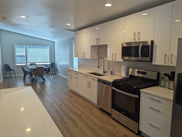 All four bedrooms offer new, comfortable beds and high-quality linens for a restful night's sleep. The master features a king bed , while the other three bedrooms have queen beds. Additional sleeping options include a couple pull-out full-size sofas in the living room and office. Two full bathrooms (both shared) provide ample space for everyone to get ready.