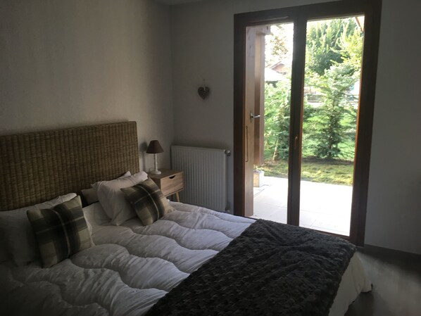 Hauptschlafzimmer: Beinhaltet ein Kingsize-Bett, einen doppelten Kleiderschrank (mit viel Platz zum Aufhängen, Regale und Schublade), eine Kommode und Zugang zur sonnigen Terrasse / zum Garten. Alle Bettwäsche und Handtücher werden gestellt.
