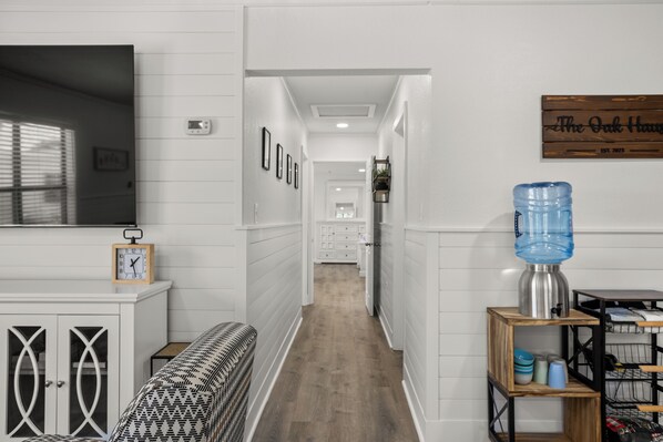The first guest room includes a queen bed and flat screen smart TV. Our primary suite has a separate seating area for private enjoyment of a flat screen smart TV that will rotate around for viewing from the king size bed. We have a dedicated workstation in this room that includes a phone charging mat and usb power strip. There is also a large dresser and portable hanging/storage rack for all of your clothing and personal items.