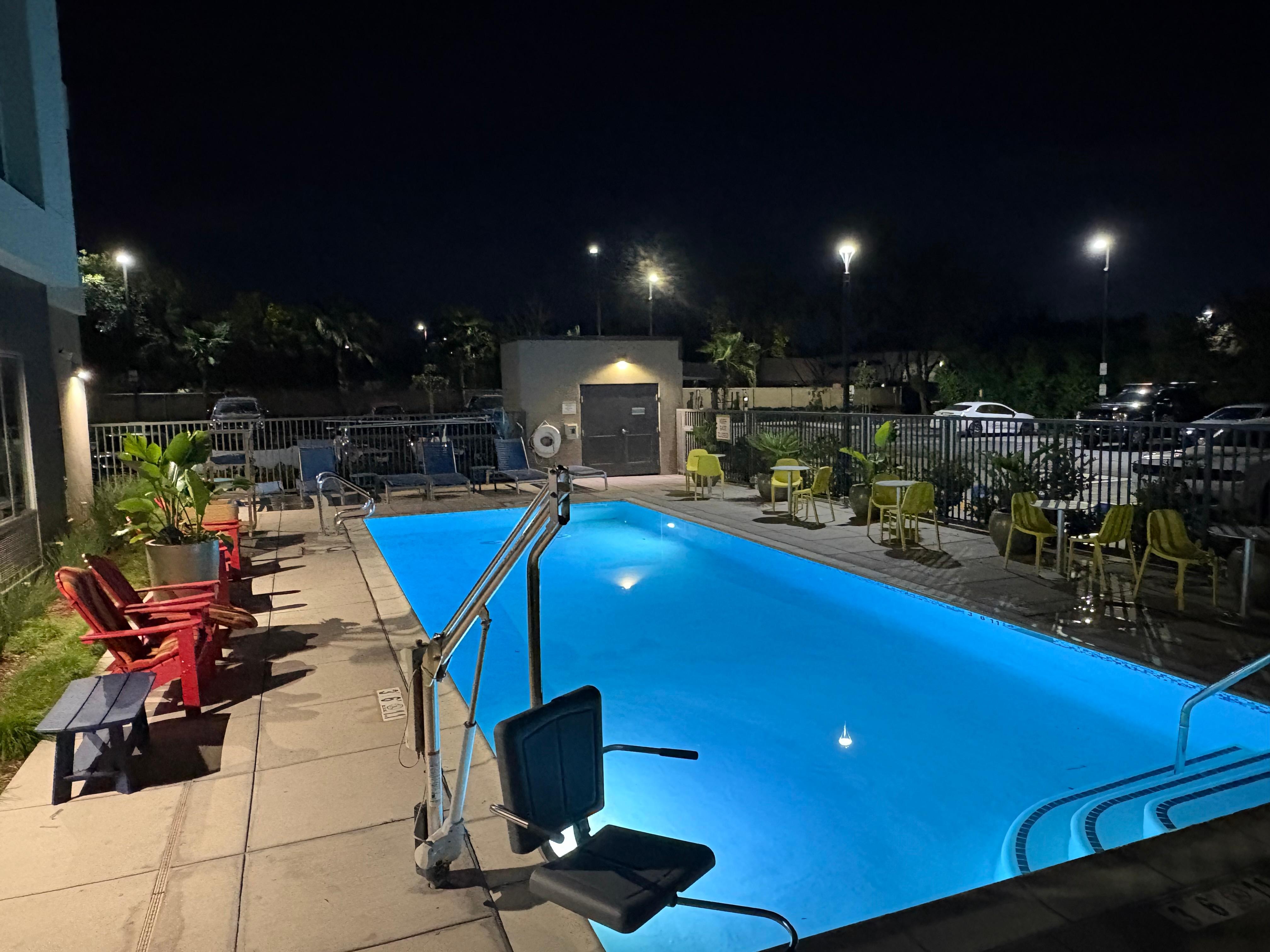 This a newer property that includes a kitchenette in rooms and is kid and pet friendly. It is clean and well maintained. However, the hotel lacks the warmth and hospitality that I experienced at other Hilton properties. Parking in an unmonitored lot was $20 a day although the hotel is surrounded by easy street parking. As a cost saving measure lights in the room and bathroom go off automatically unless there is constant motion. In addition, bright lights came on in the bathroom whenever you entered, even the middle of the night. This was inconvienent and distracting. Lights went off while showering for example. Prices were high in the automated store and bar--e.g. bottled water was $5. Although there is a pool, there were no umbrellas in the area. I was told there was a hospitality hour but in my five nights there never saw one. The hotel is in a civic industrial park near box stores and chain restaurants and is not walkable. Best for a night or two if you have kids and pets and need extra space and cooking facilities.