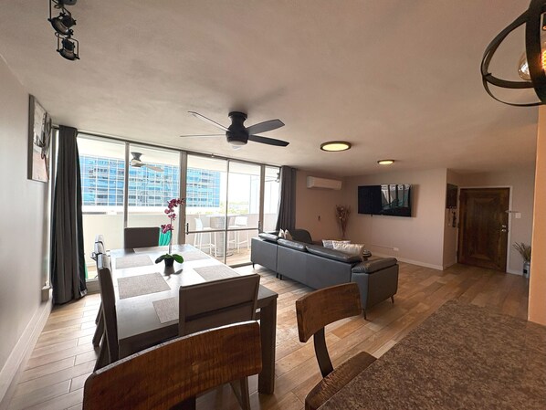 Come relax at this totally renovated 1350 sq ft Condo features 3 bedroom 2 bath with a 26 ft balcony overlooking the beautiful nightlife of San Juan while watching the waves crash from your bedroom. We redid everything from ceiling to floor, kitchen, bathrooms, and balcony. All new furniture, bedding, and fixtures were added. We have a fully equipped kitchen with pots, pans, glassware, silverware, and of course coffee pot. Complimentary use of beach chairs are left along with some beach toys