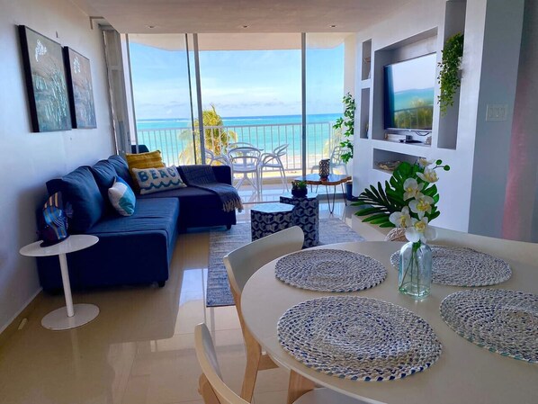 Stylish beachfront 2 bedroom 2 full baths at the super popular Marbella del Caribe, the best and most popular building of Isla Verde Beach (best urban beach in the world according to USA Today). In the heart of Isla Verde, within easy walking distance to endless options for dining and nightlife. Building has 24/7 security, pool, basket, playground and direct beach access.