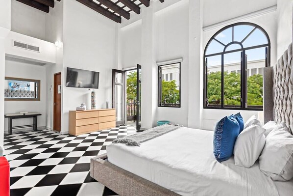 Sobald Sie die San Francisco Suite betreten, werden Sie von einem offenen Konzept begrüßt, das Küche, Esszimmer und Wohnzimmer umfasst. Die hohen Decken sind ein ikonisches Designmerkmal der Kolonialarchitektur, für die Old San Juan berühmt ist.