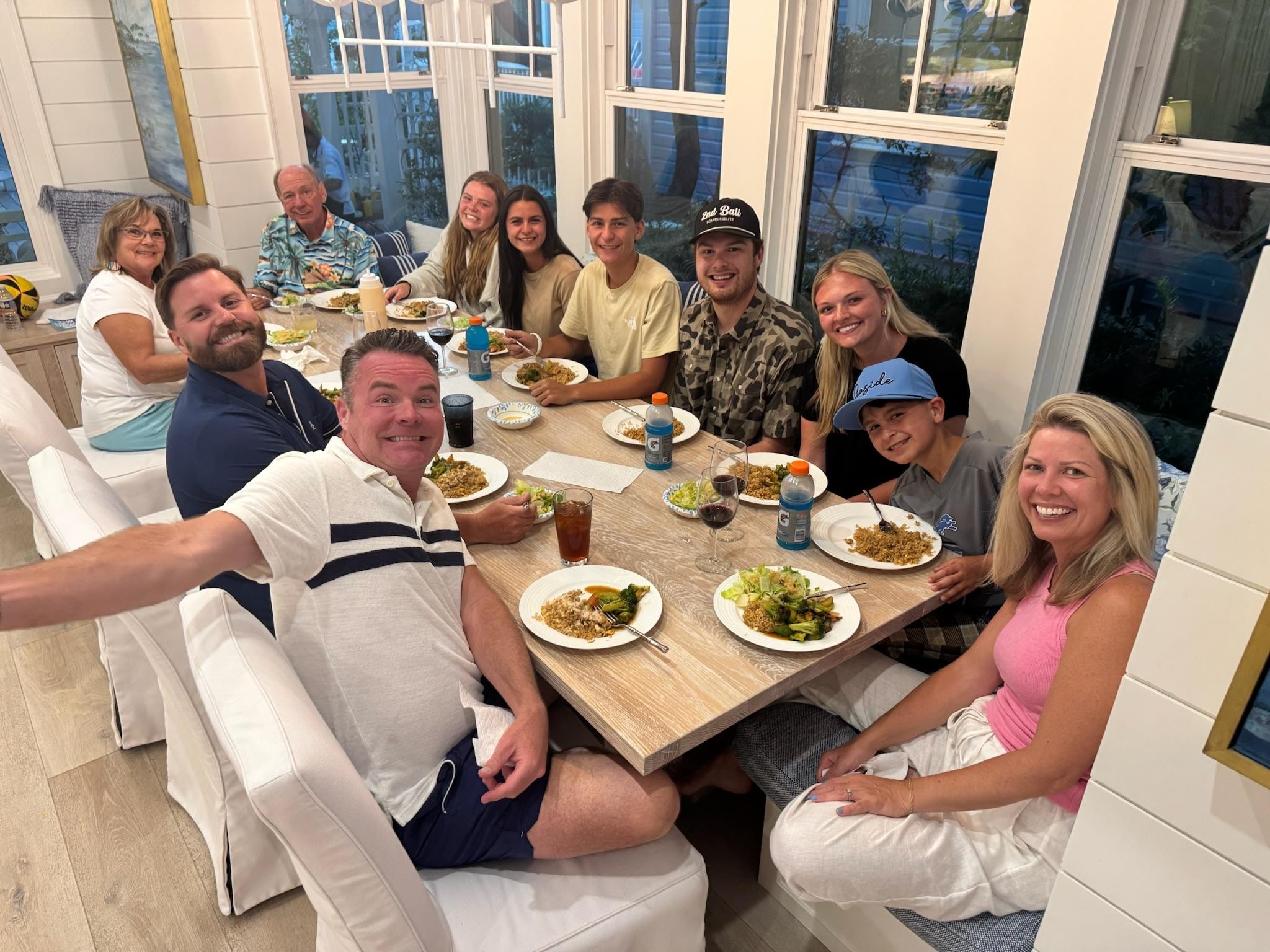 The second floor includes three more bedrooms, including a another primary bedroom suite with a king bed and private bathroom with rain shower. A middle bedroom with another king bed and private bath with a bathtub. The final bedroom on this floor features a queen bed with a bathroom shared with the third floor bunk room. There is a wet bar along with a window seat with a view of mature oak trees. The second floor also features a well-appointed screened-in porch with a Carolina hanging bed, an outdoor sofa and four lounge chairs as well as ceiling fans.
