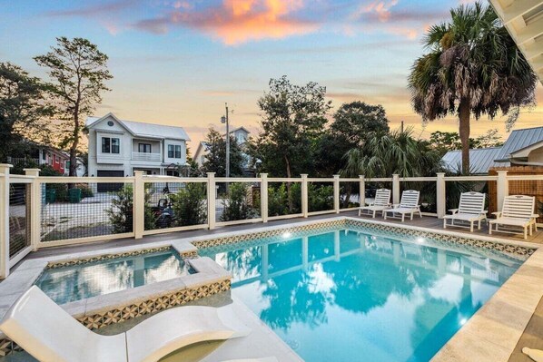 Outside, enjoy your own private outdoor oasis, complete with a refreshing pool, hot tub, sunny deck with loungers, BBQ grill, corn hole, and an outdoor shower for rinsing off after the beach. It's the perfect spot to unwind!
