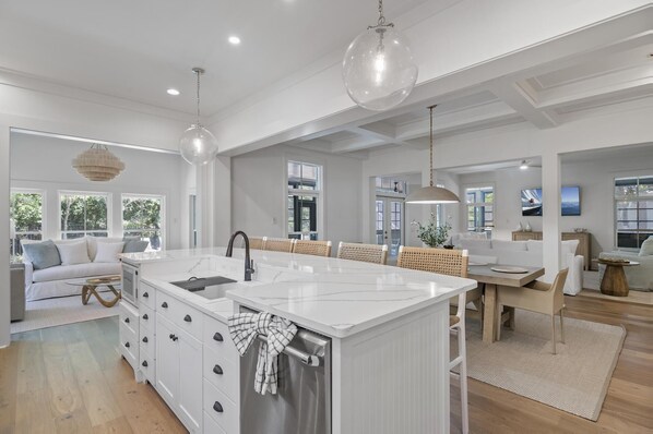 Bright white decor and pale wood floors bring a coastal flair to this 2-story home’s Southern-inspired design. Dual plush couches and matching armchairs offer plenty of seating for gathering around the 65†Smart TV after a day of beachside fun. The concrete dining room table sits beneath a coffered ceiling, creating a luxe atmosphere for 6 to dine. Cooking aficionados will adore the Thermador appliances and gorgeous countertops in the spacious kitchen—with an island that seats 5 and a cozy sitting area to the side for easy entertaining. The adjacent pantry room has 2 beverage coolers and connects to the laundry room. Grab a pitcher of sangria and savor the gentle breeze on the screened porch, which includes a 4-person table and a sitting area with a TV. Outside, 6 poolside loungers beckon guests to bask under the golden sun, and a table for 8 encourages alfresco dining. When it’s time to turn in for the night, there is a primary bedroom with a king bed and private bathroom, as well as a guest bedroom with a king bed.