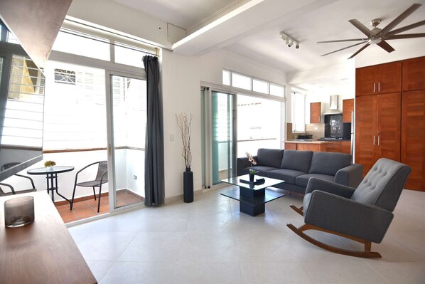 ✅ Living room with balcony - big and comfortable sofa, great rocking chair and 72" ceiling fan.